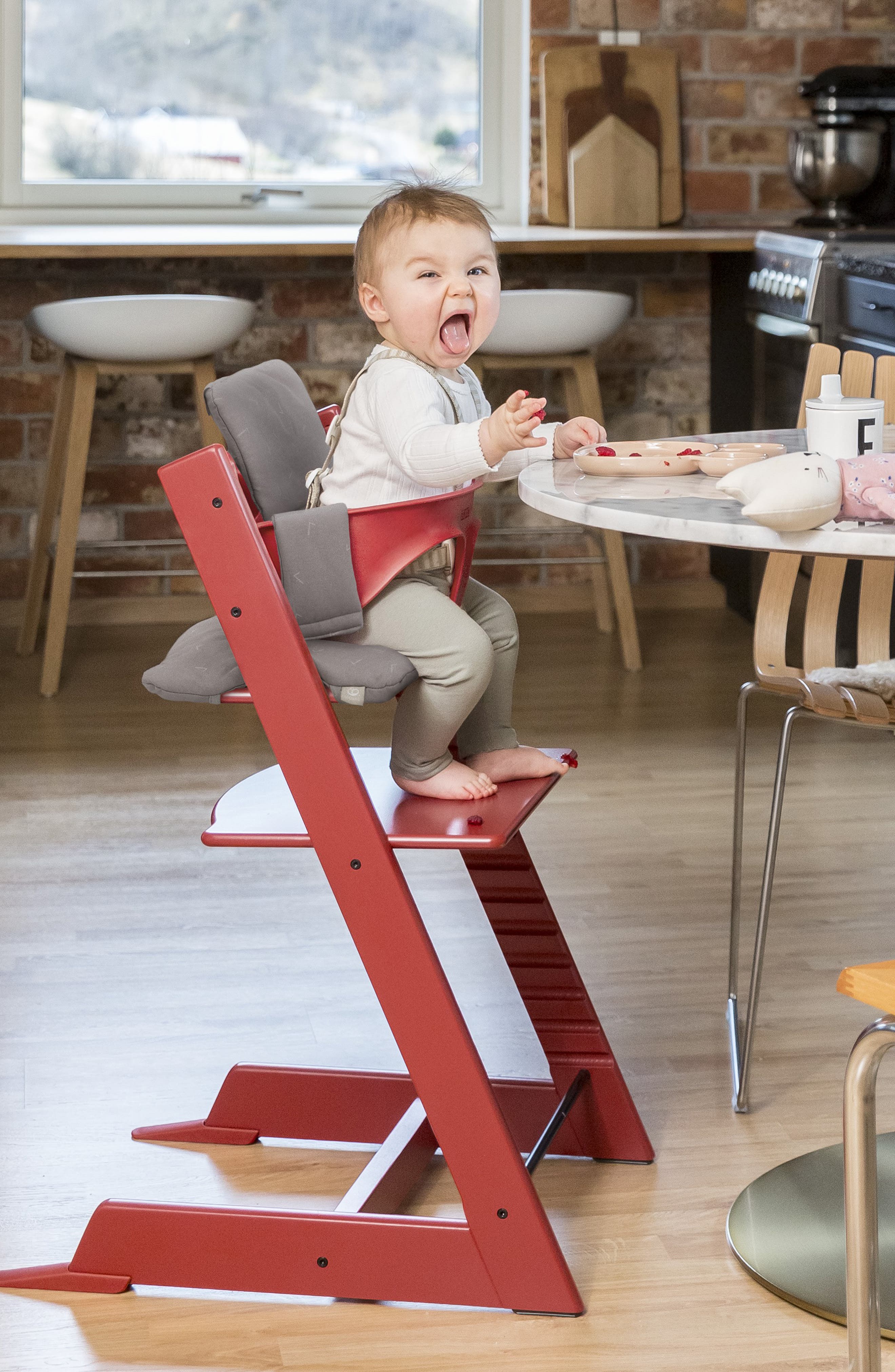 It made all the difference when it came to eating my son was a wiggler. It has been used for a young baby up to my 6yr old who still sits on it and not once has her tipped it -. Tripp Trapp Baby Cushion Sweet Hearts - Add Softness Support Comfort to Your Tripp Trapp Baby Set - Machine Washable Made with Organic Cotton - Fits All Tripp Trapp Chairs. With the tray in place which is what we do but it is a tight squeeze. I was so excited to own both Stokke highchairs because when I was deciding between the Steps and the Tripp Tripp with Walker it took me SO long to decide. I had a knock off tripp trapp albeit it was just the high chair frame which turned into an adjustable seat - they are great buys. Youll be using the table as babies tray as they get older and starting picking up foods themselves. The price seems to be half of the Stokke for pretty much the same product. Who doesnt love streamlined modern look of the Stokke Tripp Trapp high chair.